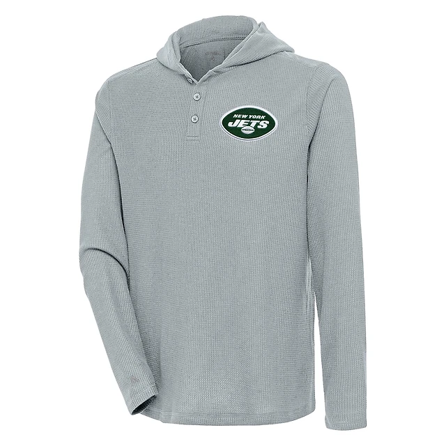 Men's Antigua Gray New York Jets Strong Hold Long Sleeve Henley Hoodie T-Shirt