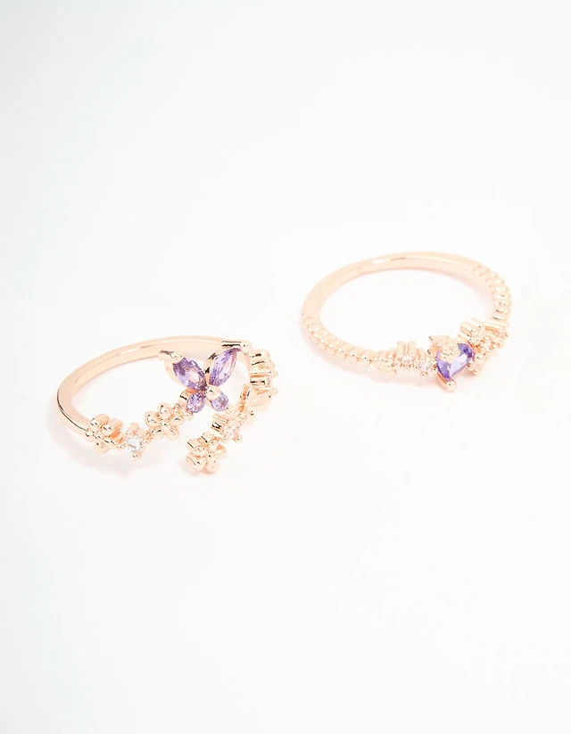 Gold Plated Cubic Zirconia Dainty Stacked Flower & Band Rings 2-Pack
