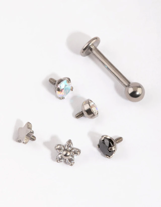 Surgical Steel Single Flat Back Bar & Pastel Gem Interchangeable Ends 6-Pack