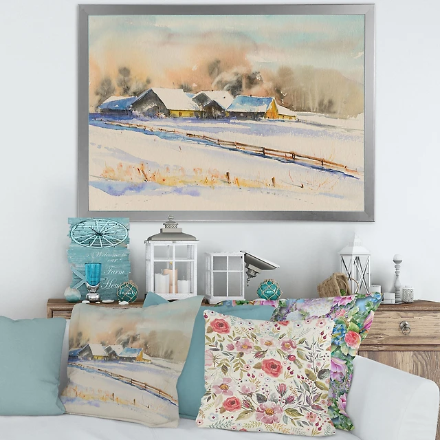 Small VIllage At Sunset Covered with Snow Canvas Wall Art Print