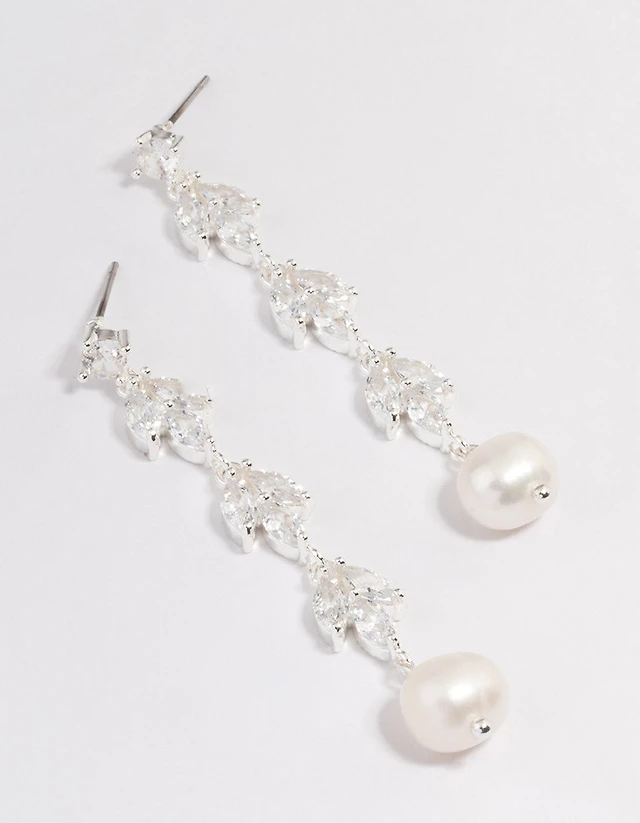 Silver Plated Leaf Pearl Cubic Zirconia Drop Earrings