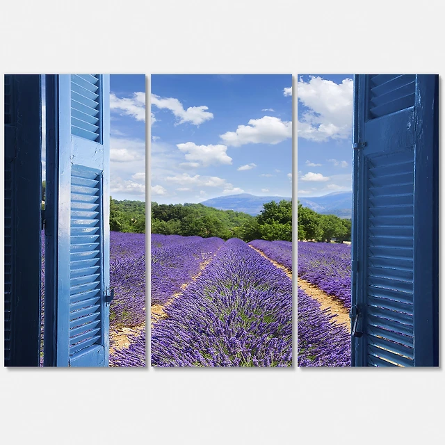 Lavender Field Through Blue Open Cottage Window Canvas Wall Art - 3 Panels
