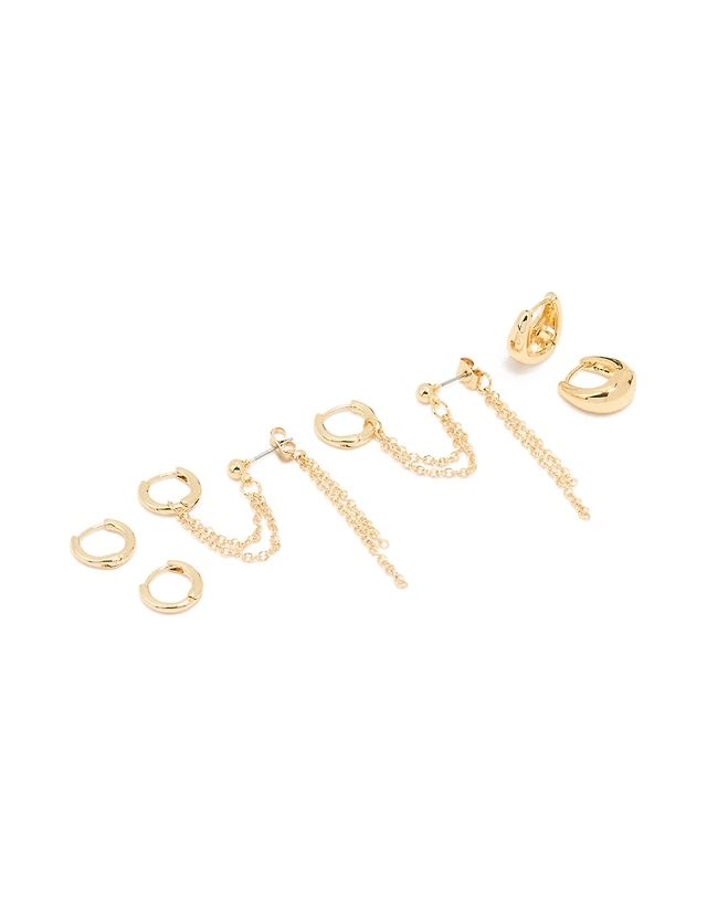 Gold Plated Molten Huggie & Cubic Zirconia Chain Earrings 4-Pack