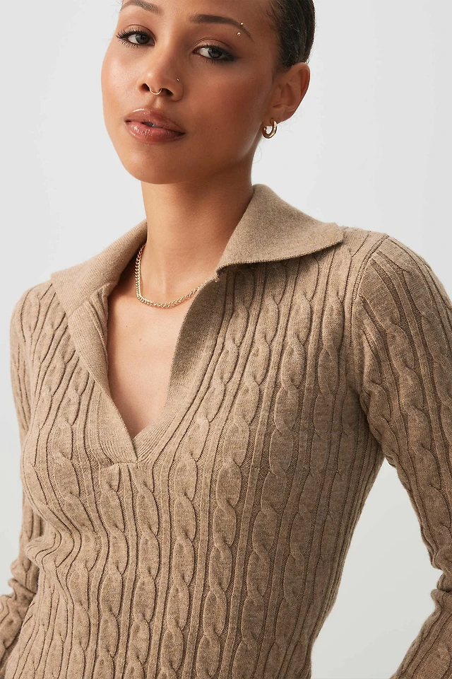 Ardene Short Cable Knit Johnny Collar Sweater in Beige | Size | Polyester/Nylon