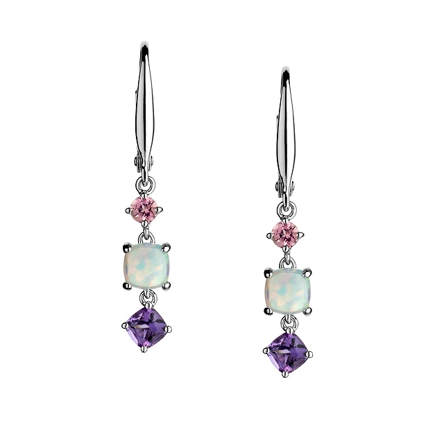 Pear-Shaped Opal, Oval Pink Sapphire and White Topaz Dangle Drop Earrings in Sterling Silver