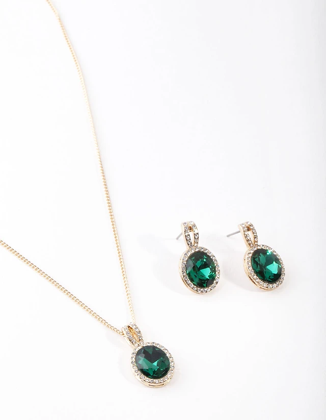 Gold Green Halo Necklace & Earrings Set