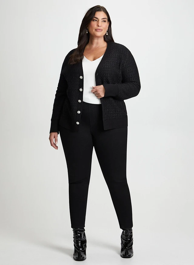 Jeweled Button Cardigan & Slim Leg Jeans