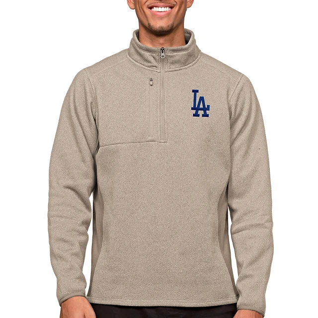 Men's Antigua Oatmeal Los Angeles Dodgers Course Quarter-Zip Pullover Top