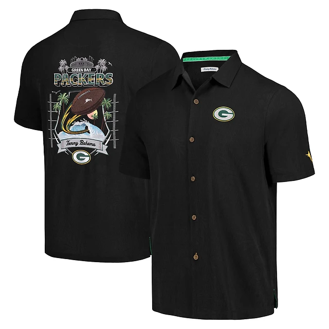 Men's Tommy Bahama Black Green Bay Packers Tidal Kickoff Camp Button-Up Shirt