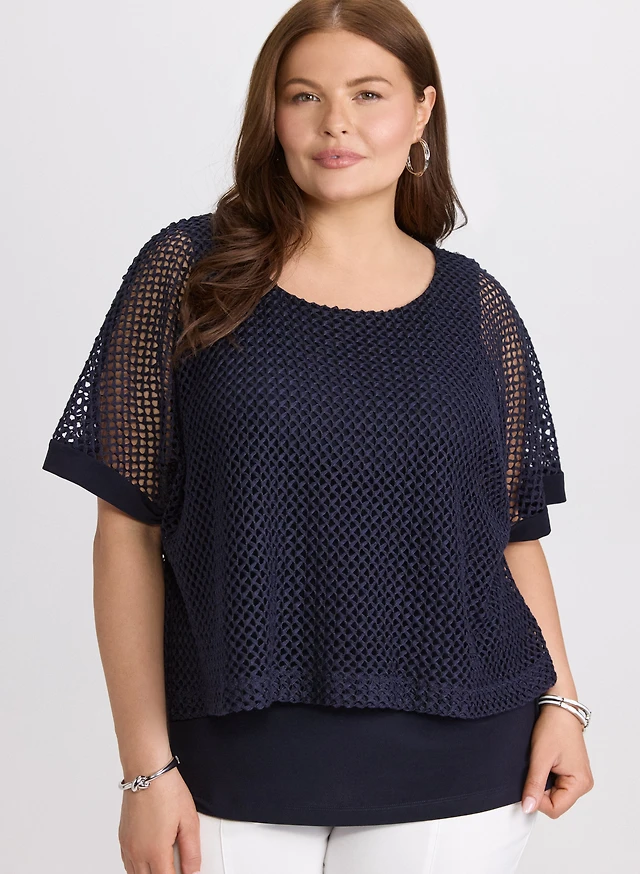 Loose Fit Long Sleeve Top with Round Neck & Mesh Trim Detail by Froccella