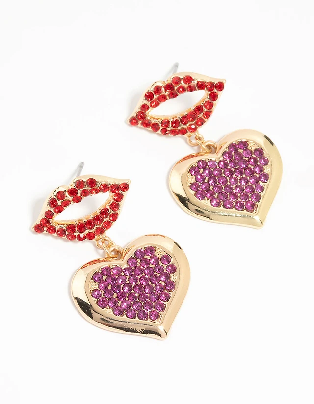 Gold Burgundy Diamante Heart Drop Earrings