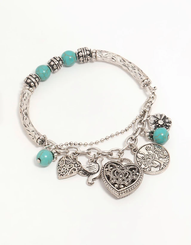 Antique Silver Turquoise Heart Charm Stretch Bracelet