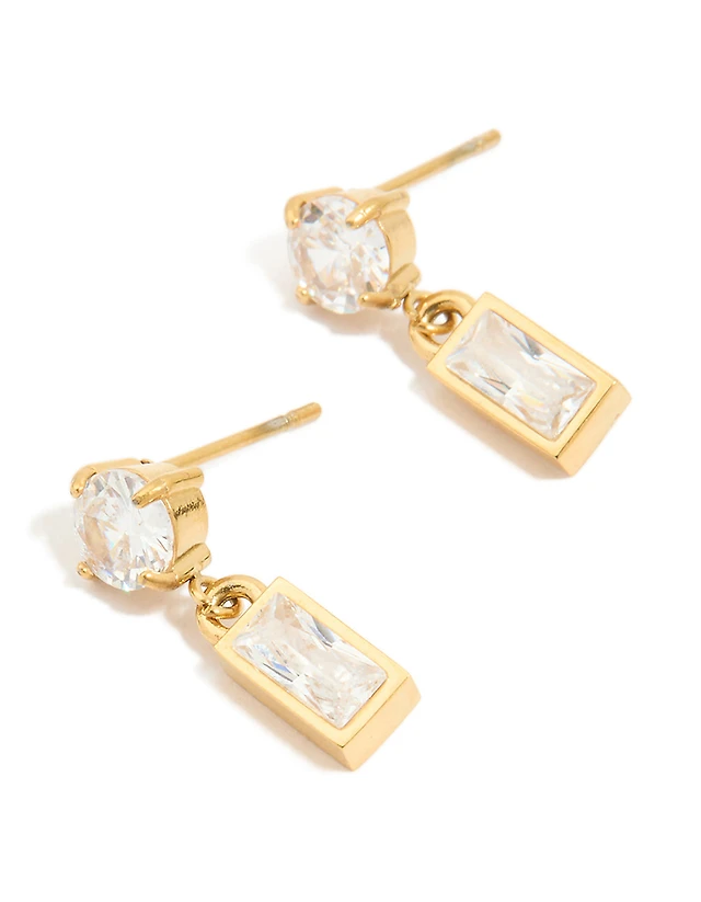 Waterproof Gold Plated Stainless Steel Cubic Zirconia Round & Baguette Drop Earrings