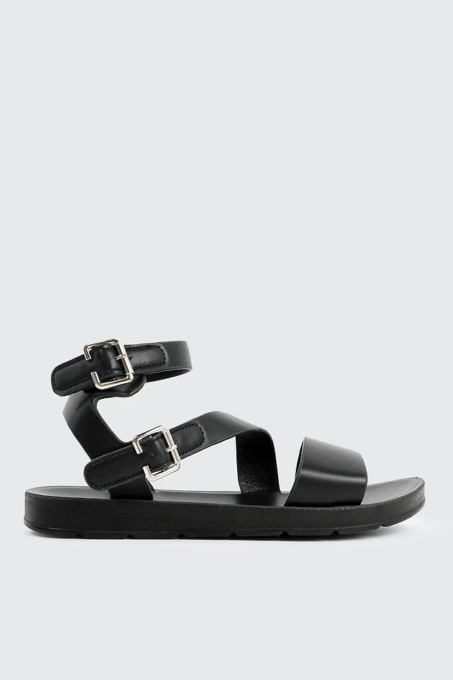 Ardene T-Strap Buckle Sandals in Black | Size | Faux Leather | Eco-Conscious