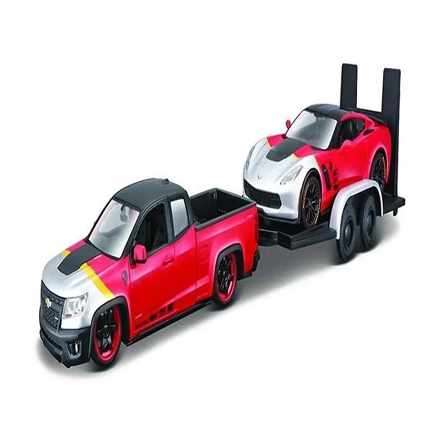 Maisto Chevrolet Colorado ZR2 Pickup Truck/Corvette Z06 with Flatbed Trailer – Red