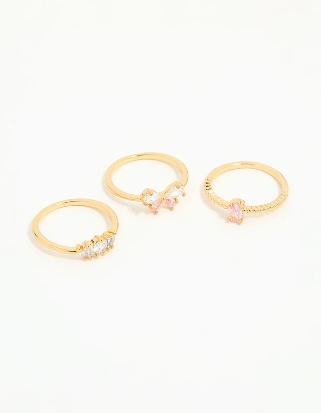 Gold Plated Pink Cubic Zirconia Bow Rings 3-Pack