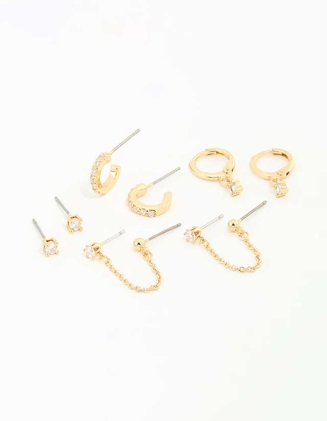 Gold Plated Brass Cubic Zirconia Oval Chain & Huggie Earrings 4-Pack