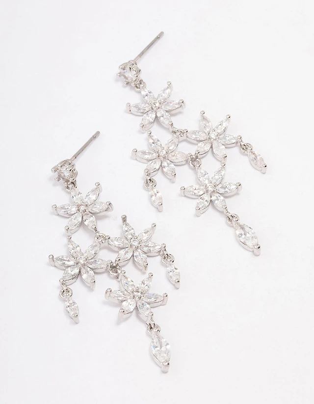 Silver Cubic Zirconia Flower Chandelier Drop Earrings