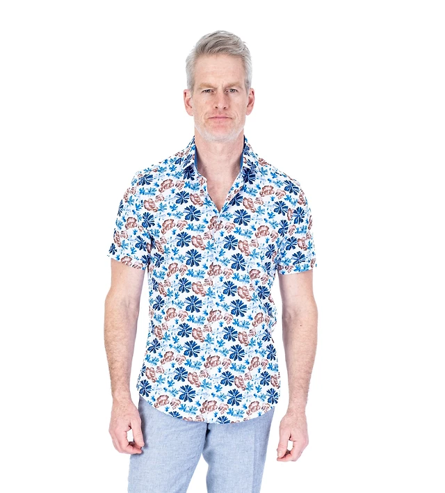 Cotton Stretch Leaf Print Short-Sleeve Sport Shirt - Blue / Brown