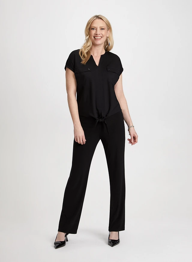 V-Neck with Beaded Trim & Button Tab Detail Pants