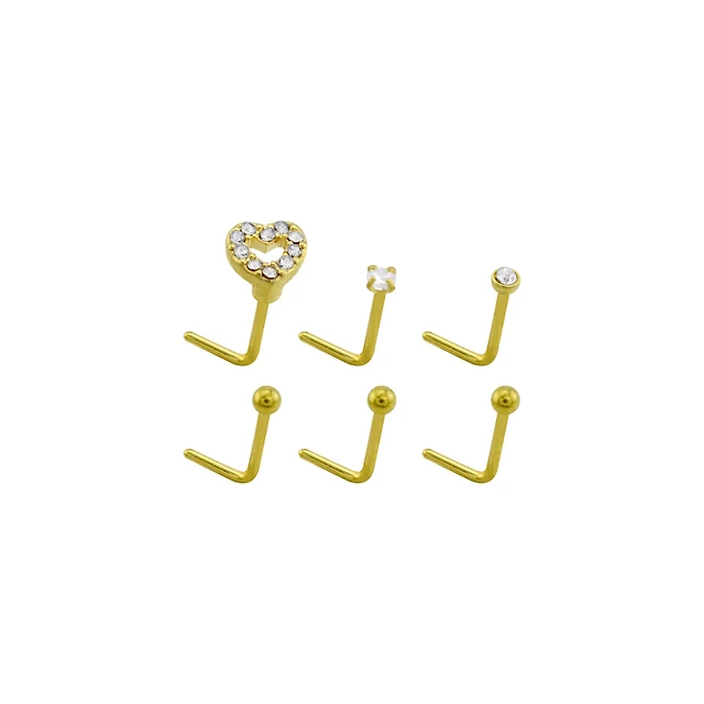 Multi-Pack CZ Goldplated Stone Heart L-Bend Nose Rings 6 Pack - 20 Gauge