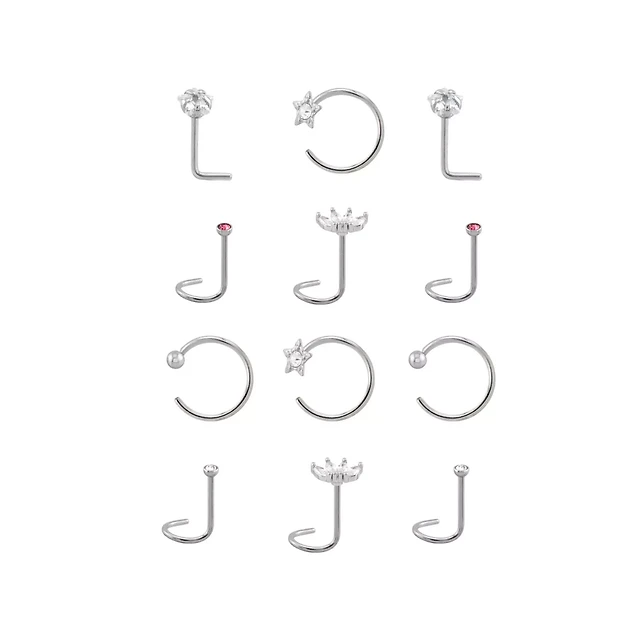 Multi-Pack CZ Silvertone Hoop and Half Hoop Nose Rings 12 Pack - 20 Gauge
