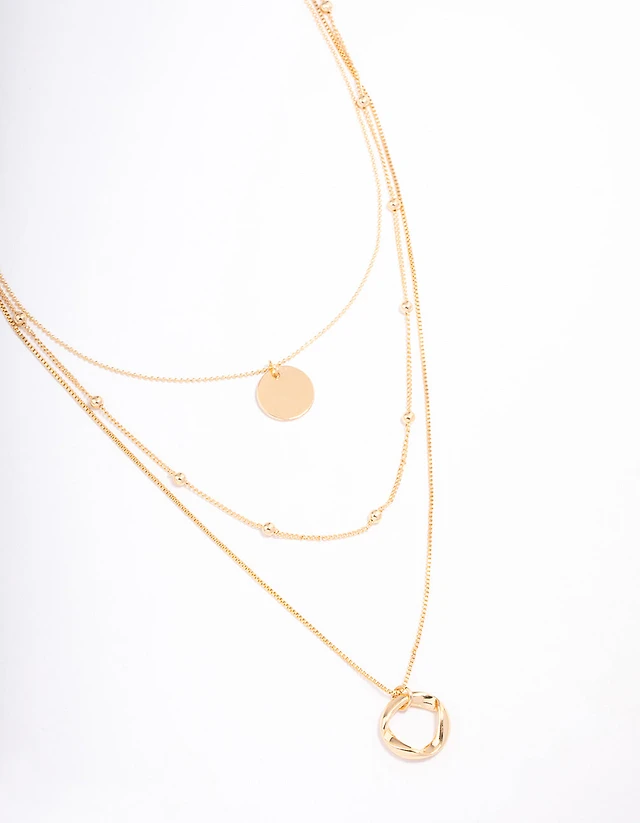Gold Organic Circle Disc Triple Row Necklace