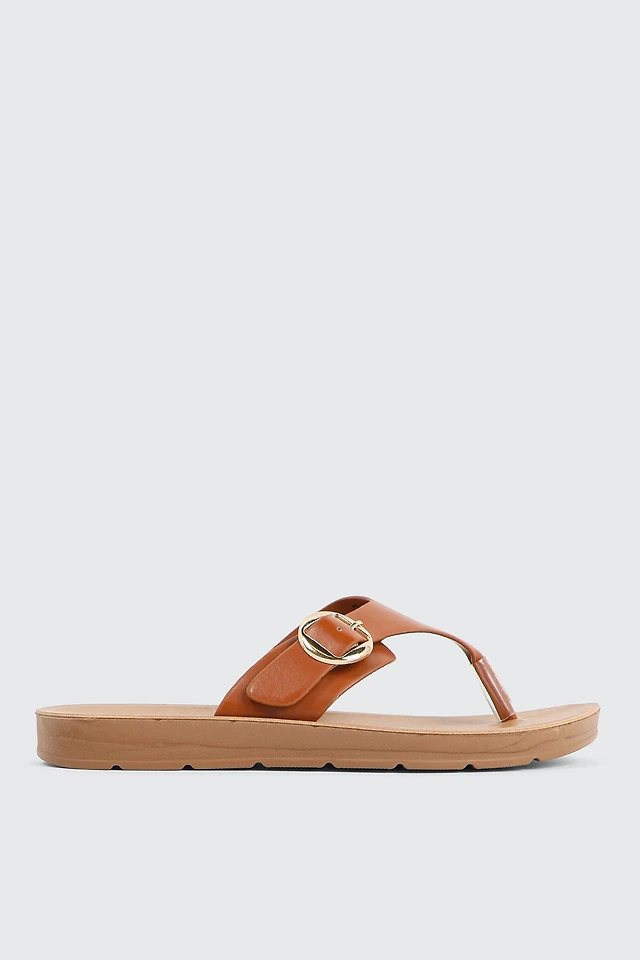 Ardene Flat Sandals with Chunky Buckle in Cognac | Size | Faux Leather | Eco-Conscious