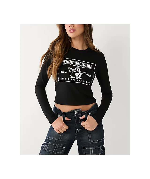 True Religion Logo Rivets V Notch Black Long Sleeve Crop T-Shirt