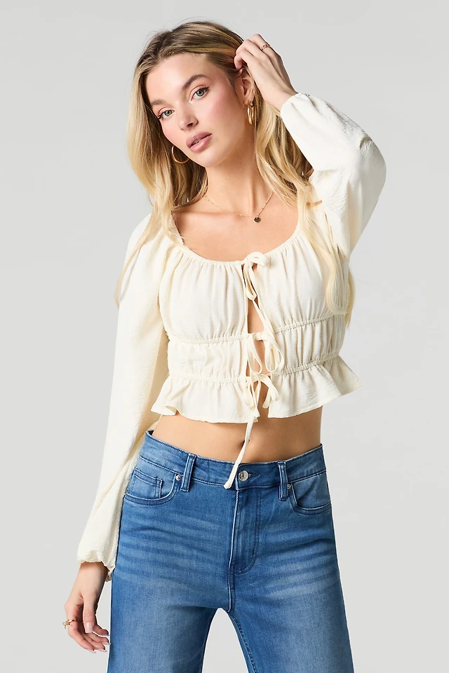 Ardene Crop Pointelle Long Sleeve Top in | Size | Polyester/Viscose