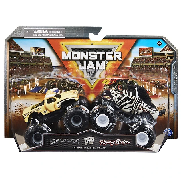 Monster Jam, Official Bulldozer Vs. Racing Stripes Die-Cast Monster Trucks, 1:64 Scale