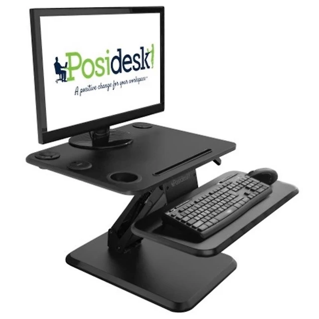 Bureau assis-debout à piédestal avec porte-gobelet, haut-parleurs Bluetooth et chargeur sans fil