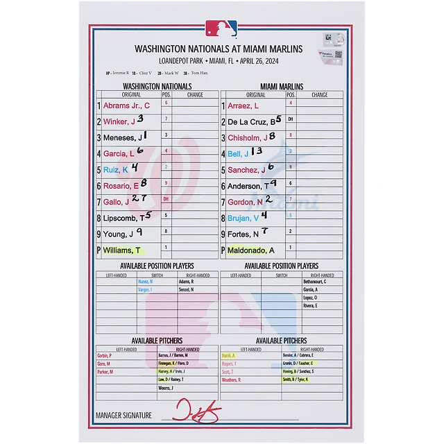 Washington Nationals Game-Used Lineup Card vs. Miami Marlins on April 26, 2024