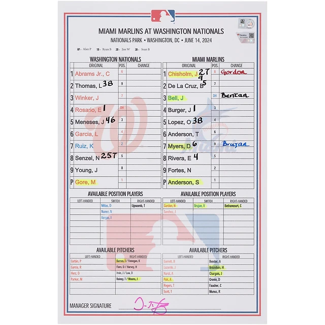 Washington Nationals Game-Used Lineup Card vs. Miami Marlins on June 14, 2024
