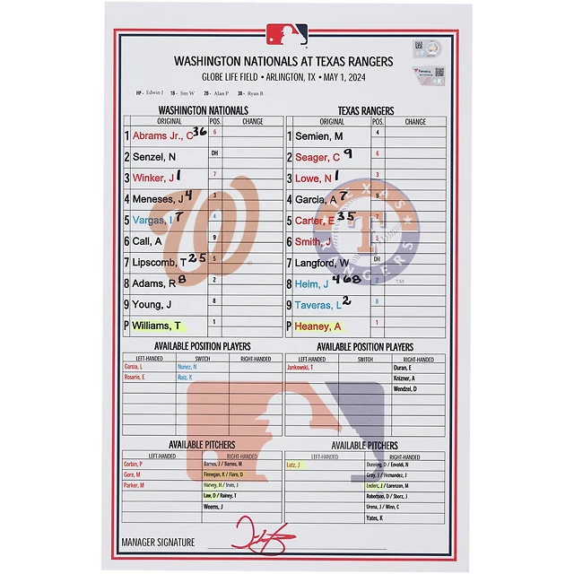 Washington Nationals Game-Used Lineup Card vs. Texas Rangers on May 1, 2024
