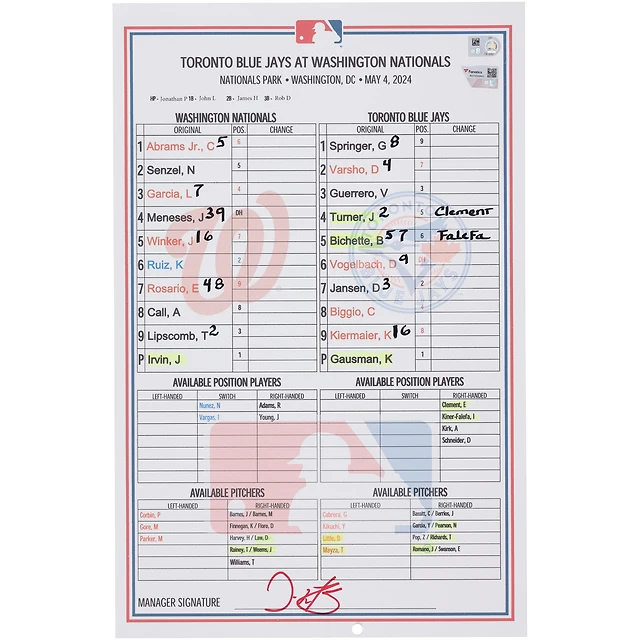Washington Nationals Game-Used Lineup Card vs. Toronto Blue Jays on May 4, 2024