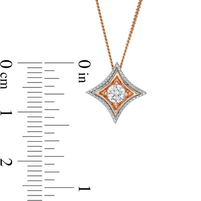 Uniquely fashioned, this Certified Canadian diamond solitaire pendant is sure to be noticed. Crafted in 10K two-toned gold, this design features a sparkling 0.18 ct. certified Canadian diamond - boasting a colour rank of I and clarity of I2 - inside a convex kite-shaped frame of rose gold and textured white gold. Polished to a bright shine, this pendant suspends along a 16.0-inch rose gold curb chain with 2.0-inch extender that secures with a lobster claw clasp. This style arrives with a certificate that includes a photo and description of the diamond, which guarantees quality and can be used for insurance purposes.