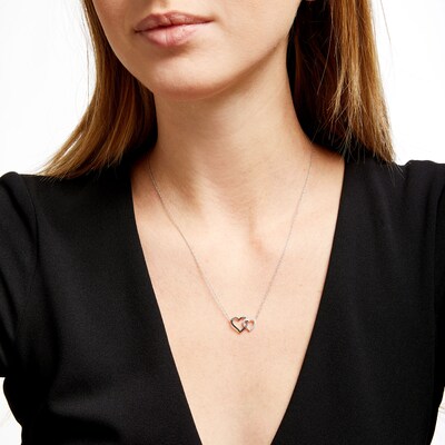 Double up on love and sweet style when you wear this charming black and white diamond interlocking hearts necklace.