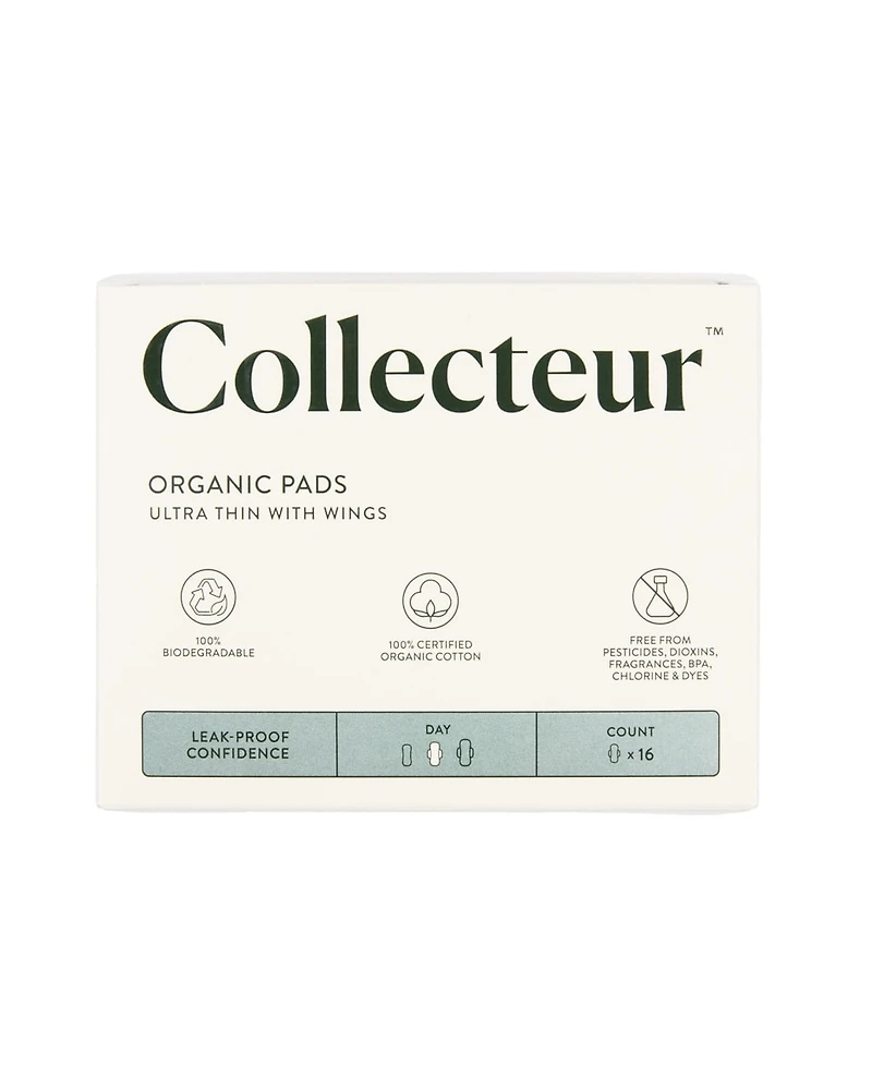 Experience comfort, confidence, and conscious design with Collecteur’s organic pads. Crafted from 100% certified organic cotton, these ultra-thin pads with wings feature patented safety channel technology for up to 50% more absorbency, offering superior protection without compromising breathability. Thoughtfully contoured to the female body, each pad provides secure, flexible comfort with reliable wings that stay in place throughout the day. Fully biodegradable and wrapped in recyclable wrapping, they’re as gentle on the planet as they are on your skin. Proudly hypoallergenic and uncompromisingly pure, free from pesticides, dioxins, fragrances, dyes, and chlorine, Collecteur is proud to redefine period care with intention, integrity, and style.