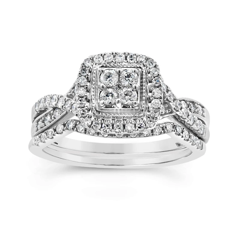 Celebrate the beauty of love with the 10K White Gold 0.50CTW Diamond Bridal Set featuring a square center cluster. The engagement ring is perfectly complemented by two matching wedding bands, completing the set in exquisite harmony. Crafted in luminous 10K white gold, this bridal set is a testament to the enduring nature of your commitment. The brilliant sparkle of the diamonds and the timeless design make this set a symbol of your unique and everlasting love story.