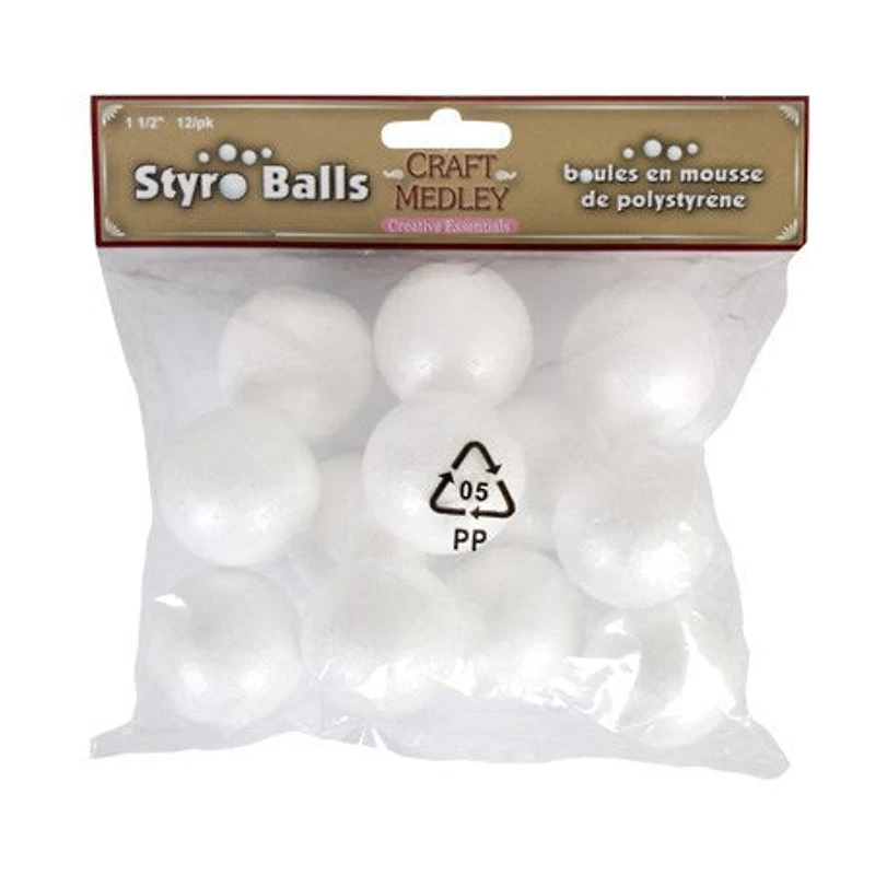 Polystyrene foam balls for arts and crafts. Package of 12 balls of 1 ½" diameter.