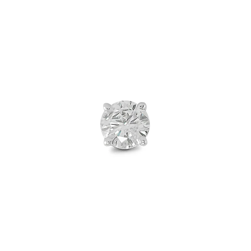 A classic round brilliant cut diamond sits alone in a 14kt white gold, four claw setting. A single 0.10ct diamond adorns this single earring that is secured with a threaded post and screw on back.