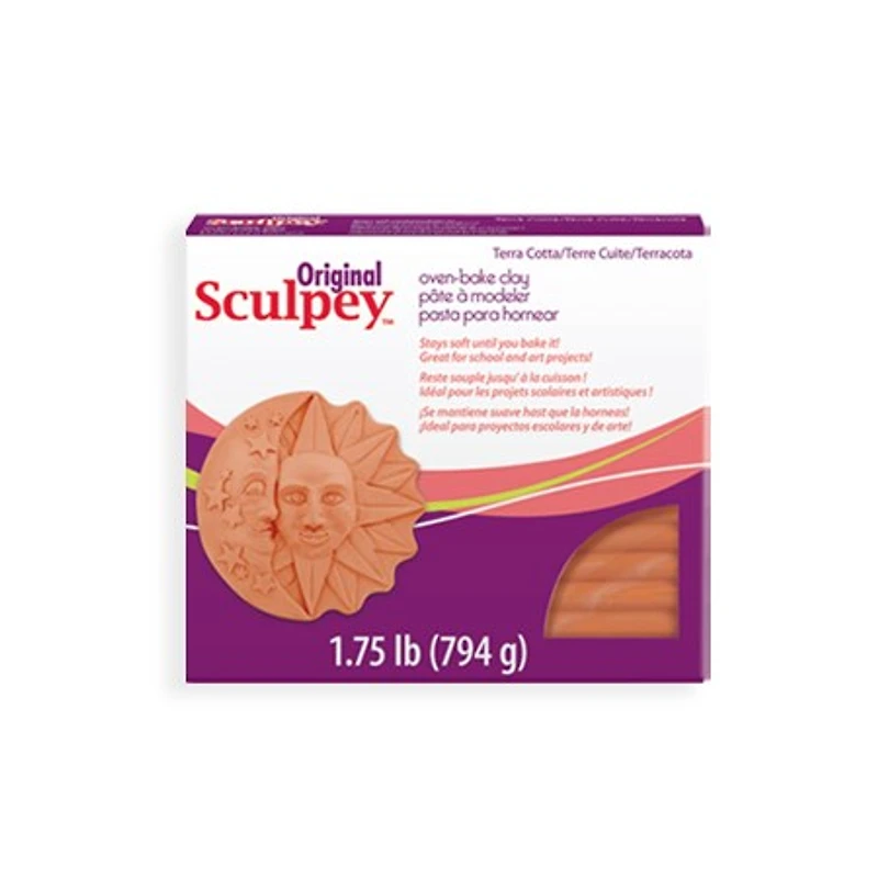 Original Sculpey is the original polymer ovenbake clay. This package contains 1.75 lbs of terracotta clay.Original Sculpey works and feels like ceramic clay but will not dry out when exposed to air. Shape into desired form and bake at 275F (135 C) for about 15 minutes per 1/4" of thickness. Once cooled, your project can be sanded, drilled, carved, painted with water-based acrylics or glazed. This formulation is ideal for sculpture and children's projects.