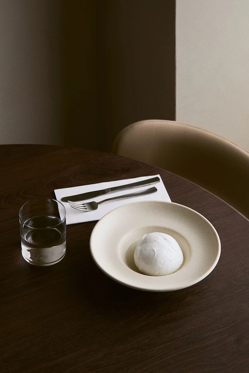 Two small, deep plates in stoneware. Reactive glaze creates beautiful, variegated coloring, giving each plate a unique appearance.