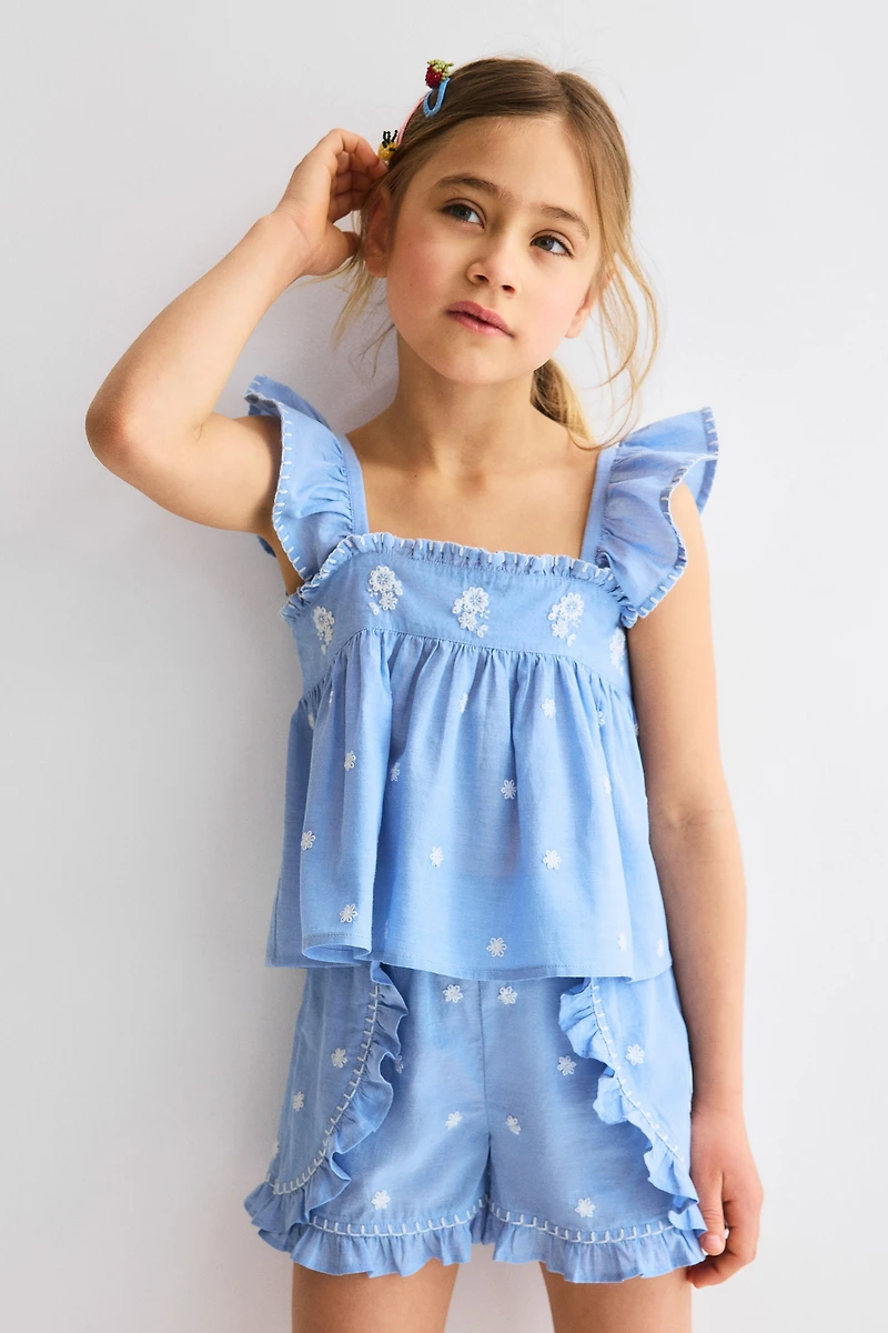 Set in airy woven cotton with a top and coordinated shorts, both featuring embroidered motifs and whipstitching. Strappy top with flounce-trimmed shoulder straps, a square neckline, and a gathered seam at top. Shorts with an elasticized waistband and ruffle trim at sides extending around hems.