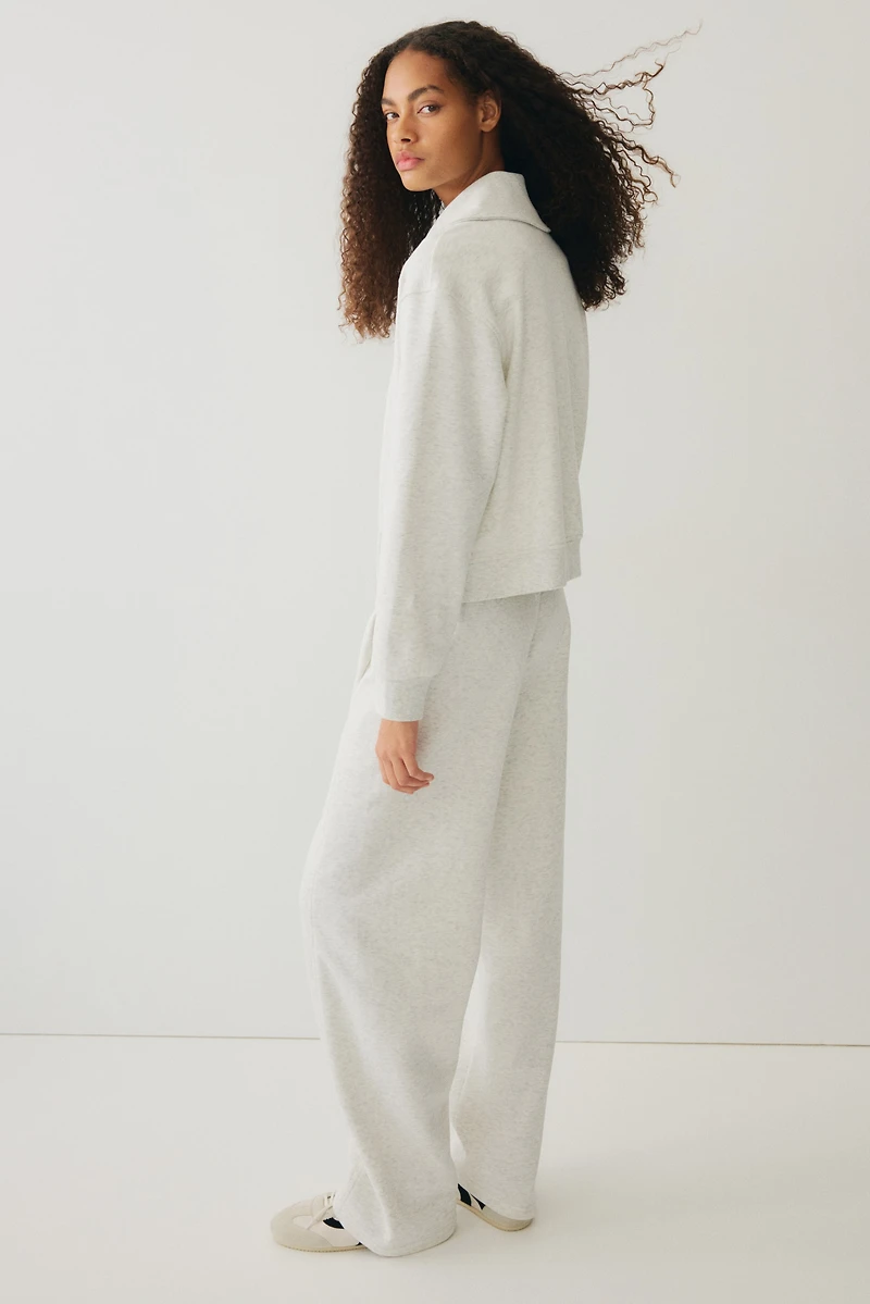 Set in lightweight fabric with a sweatshirt jacket and sweatpants, both with a soft, brushed inside. Jacket with a high collar, concealed zipper at front, welt front pockets, and ribbing at cuffs and hem. Sweatpants with covered elastic at waistband, discreet side pockets, curved side seams, and straight legs.