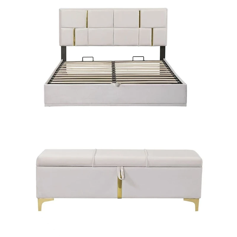 Elevate your bedroom with this 2-piece set featuring a Queen Size Upholstered Platform Bed with hydraulic storage and a matching ottoman. Wrapped in soft velvet with elegant gold accents, both pieces combine timeless charm and modern luxury. The hyd