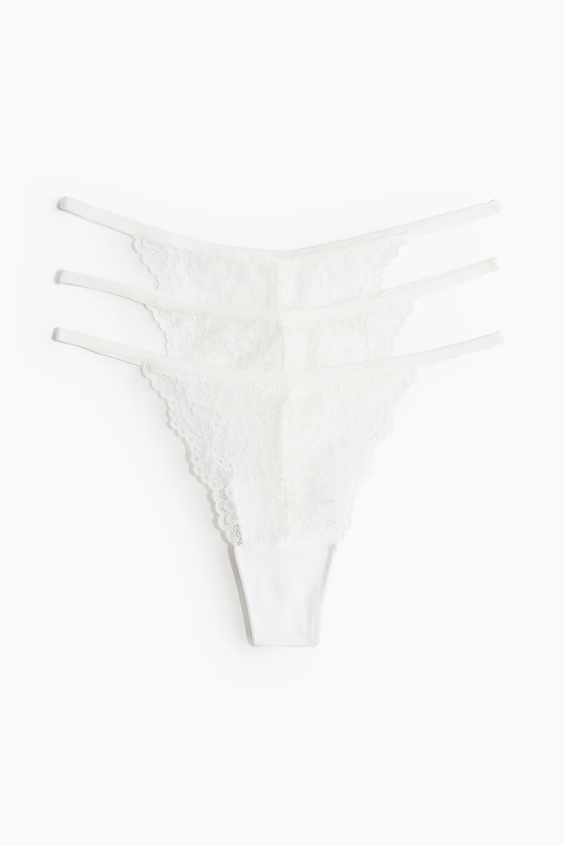 Thong briefs in lace with a low waist, narrow sides, and lined gusset.