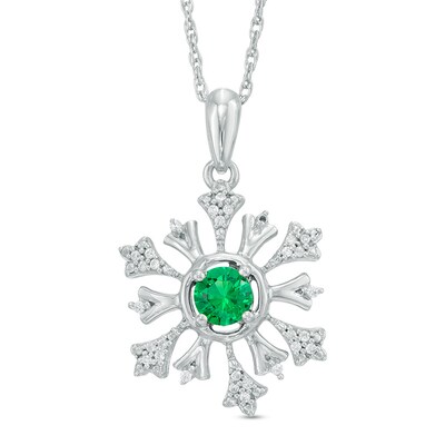Crisp and cool, this exquisite fashion pendant is a sparkling look she'll turn to often. Crafted in sterling silver, this delightful design features a 4.5mm lab-created verdant-green emerald centre stone. Shimmering diamonds add glimmer to the snowflake style. Radiant with 0.09 ct. t.w. of diamonds and a brilliant buffed lustre, this pendant suspends along an 18.0-inch rope chain that secures with a spring-ring clasp.