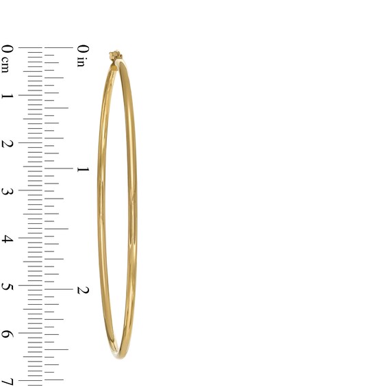 Create a trendy look with the classic style of these hoop earrings. Crafted in warm 10K gold, each 65.0 x 2.0mm hoop showcases a tubular design that is perfect for anytime wear. Buffed to a brilliant lustre, these earrings secure with latch backs.